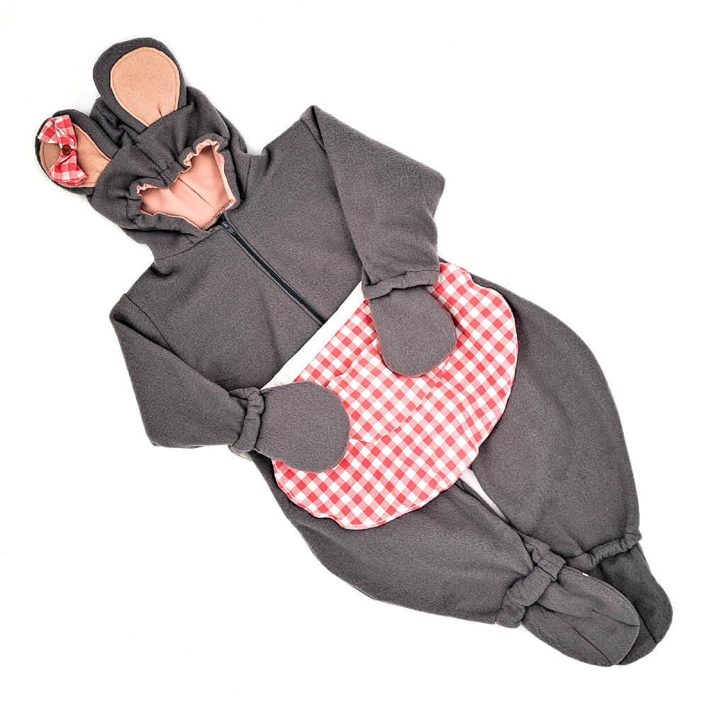 Kostum je narejen iz toplega in mehkega flisa, ki otroka prijetno greje v hladnejšem pustnem času. Sprednje šapice lahko otrok uporablja kot rokavice, spodnje šape pa imajo všito gumico, ki omogoča enostavno pritrditev čez čevlje. Predpasnik je snemljiv, kar daje kostumu dodatno praktičnost in igrivost. Pustni kostum zobna miška Manca je popolna izbira za pustne povorke, otroške zabave, rojstnodnevne dogodivščine ali igro doma. S svojo toplino, udobjem in pravljično zgodbo bo poskrbel za nepozabno pustno doživetje ter navdušil otroke in starše.